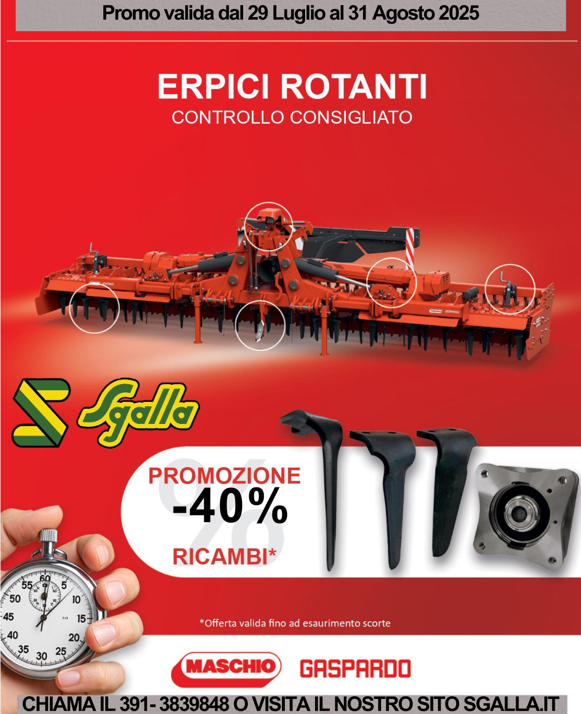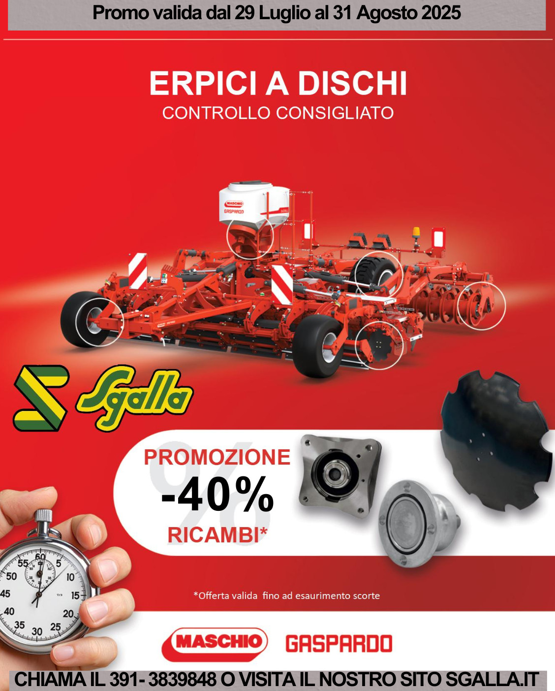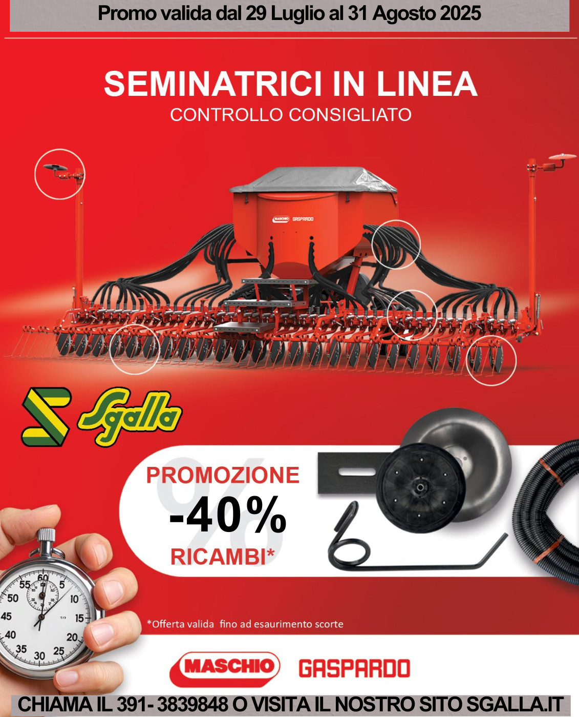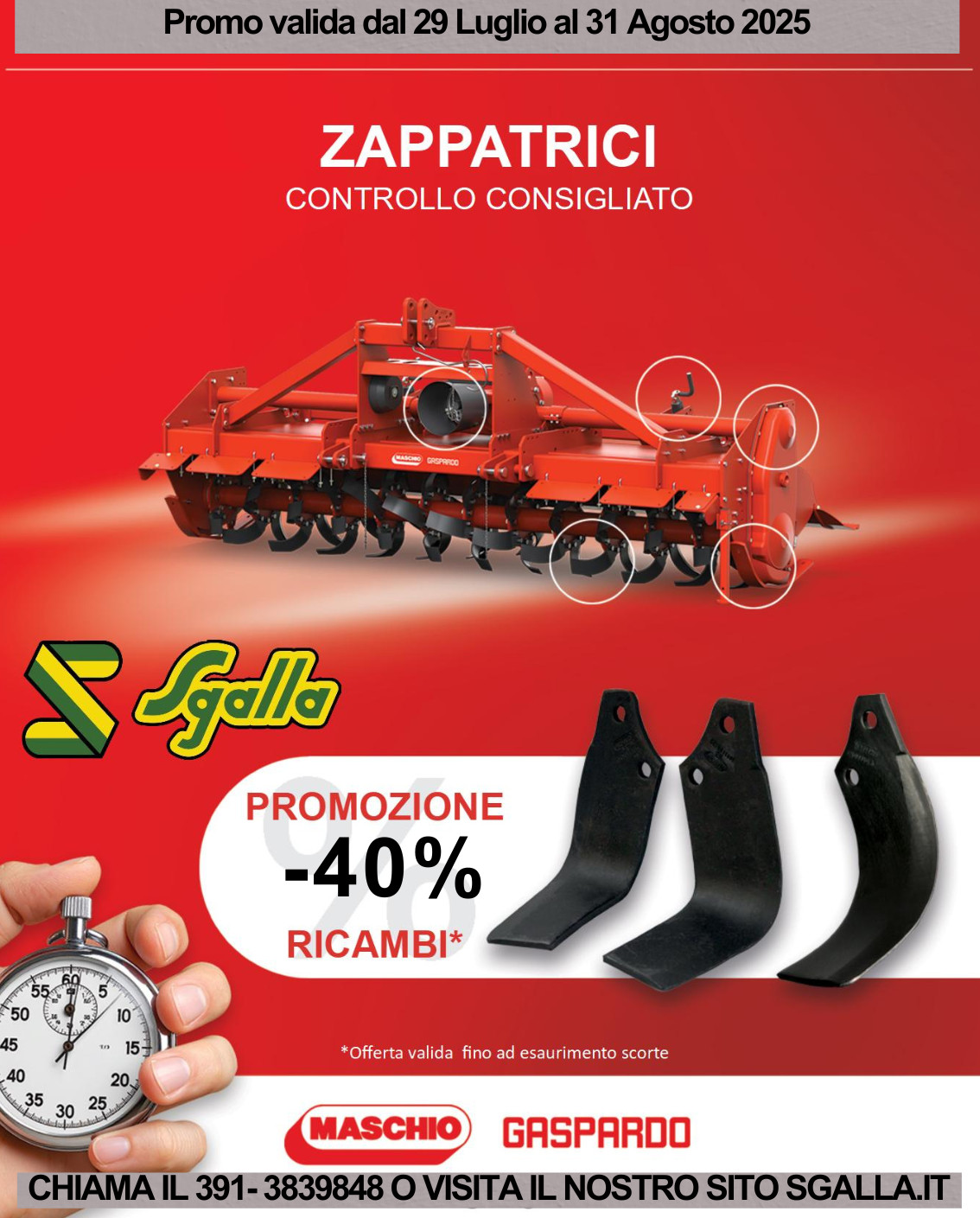 Approfitta della nostra offerta speciale sui ricambi originali Maschio-Gaspardo, con sconti fino al 40% sulle parti soggette ad usura. Che tu abbia una zappatrice, un erpice rotante, una trinciatrice, un dissodatore, una seminatrice su sodo o combinata, abbiamo i componenti che ti servono per mantenere alte le prestazioni! Su Sgalla.it, troverai una vasta gamma di ricambi essenziali per la lavorazione del terreno e la semina, tutti coperti dalla qualità e affidabilità Maschio-Gaspardo.