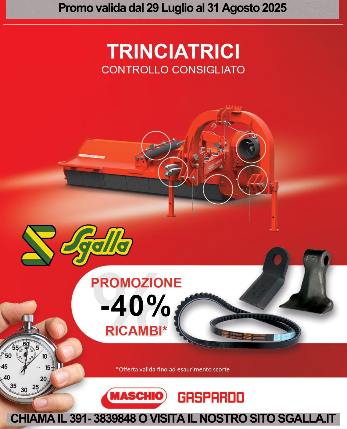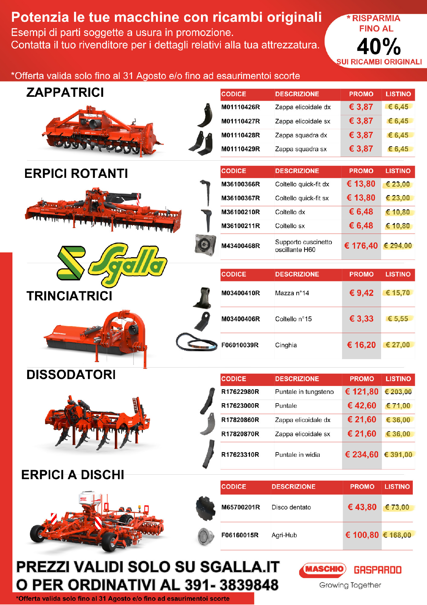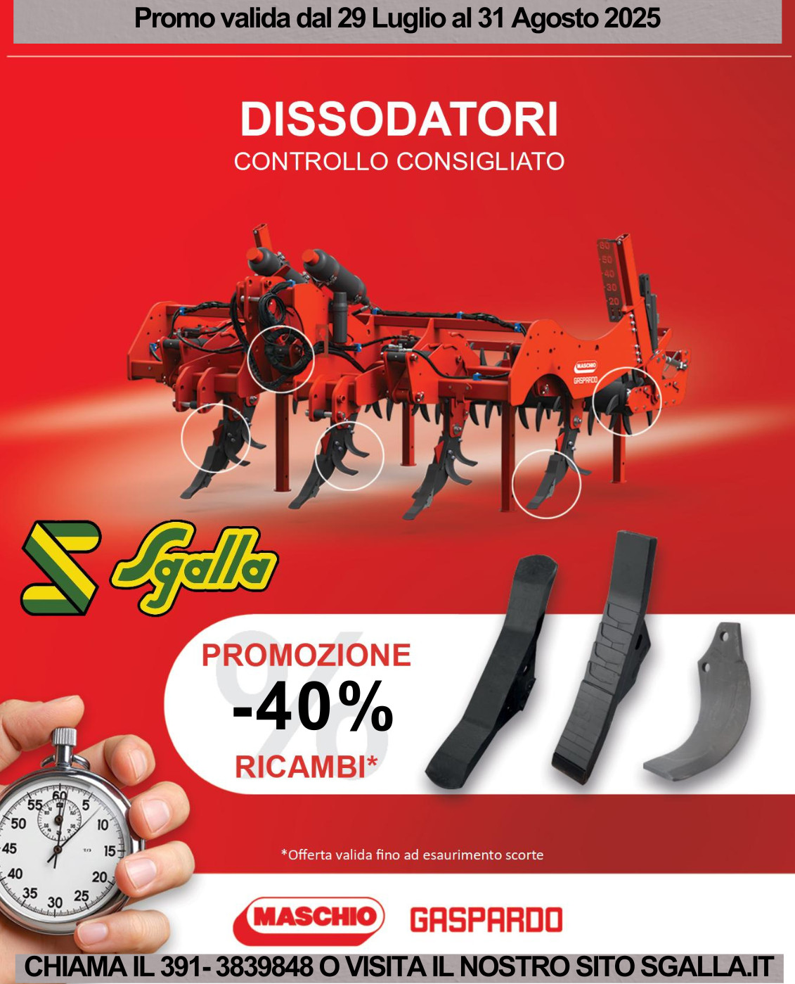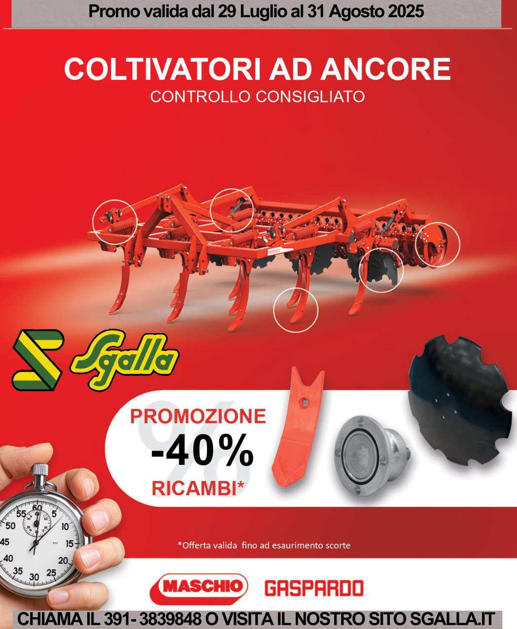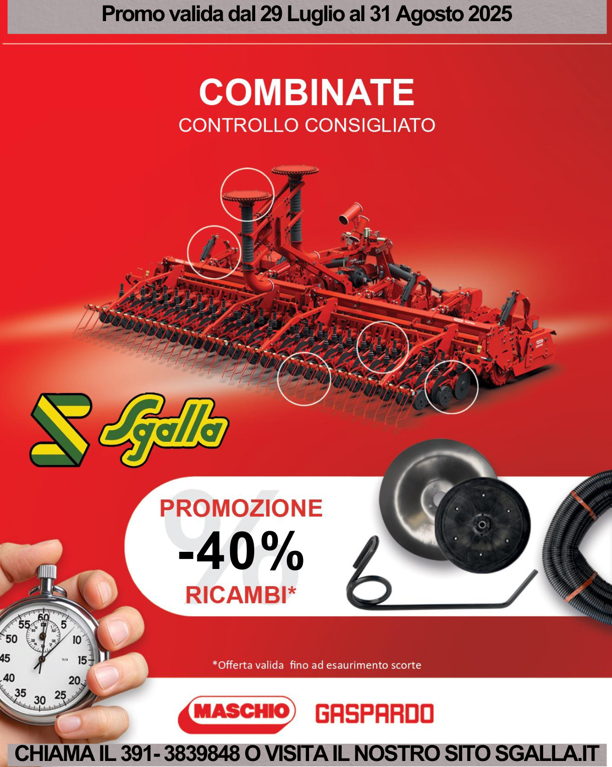 Approfitta della nostra offerta speciale sui ricambi originali Maschio-Gaspardo, con sconti fino al 40% sulle parti soggette ad usura. Che tu abbia una zappatrice, un erpice rotante, una trinciatrice, un dissodatore, una seminatrice su sodo o combinata, abbiamo i componenti che ti servono per mantenere alte le prestazioni! Su Sgalla.it, troverai una vasta gamma di ricambi essenziali per la lavorazione del terreno e la semina, tutti coperti dalla qualità e affidabilità Maschio-Gaspardo.