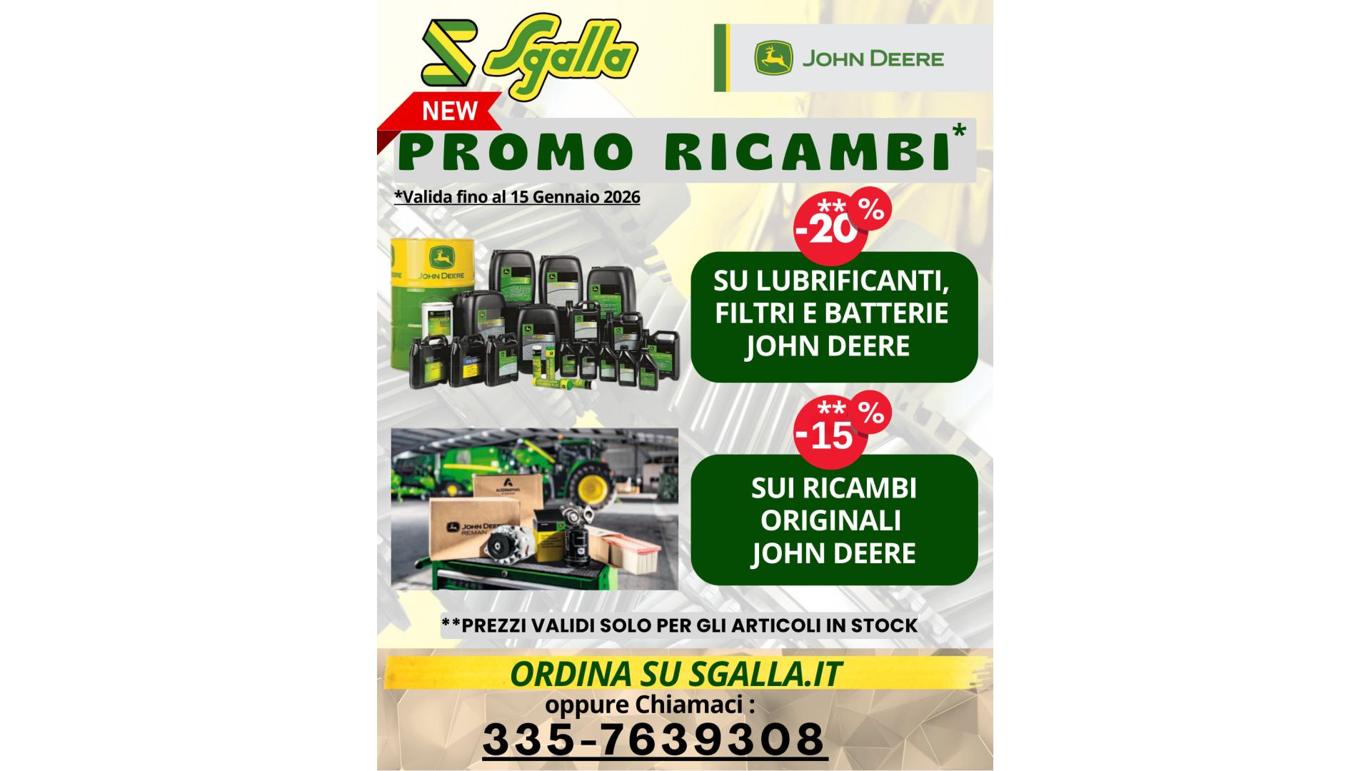 Approfitta subito della nostra straordinaria promozione sui ricambi originali John Deere, valida esclusivamente fino al 15 Gennaio. È il momento ideale per effettuare la manutenzione e l'acquisto di componenti essenziali, come filtri, lubrificanti e batterie, ottenendo un risparmio significativo senza rinunciare alla qualità e all'affidabilità certificate.