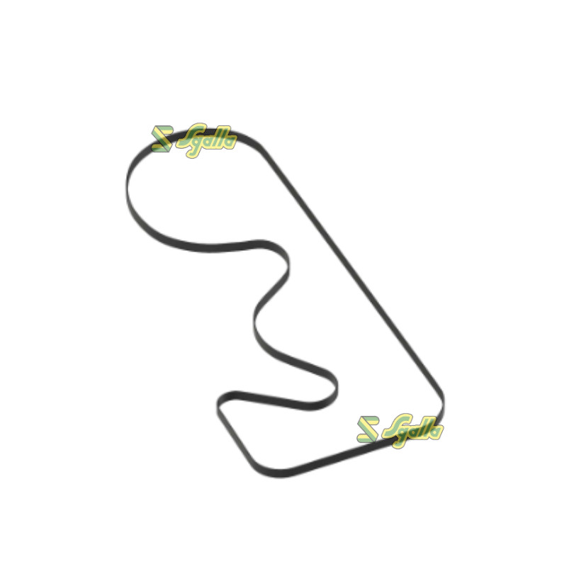 Cinghia John Deere ref. L115658. Cinghia trapezoidale di trasmissione ausiliaria del motore, lunghezza effettiva 2285 mm (89,96 pollici), numero nervature 8 e tipo di sezione PK. Soddisfa gli standard SAE J1459.