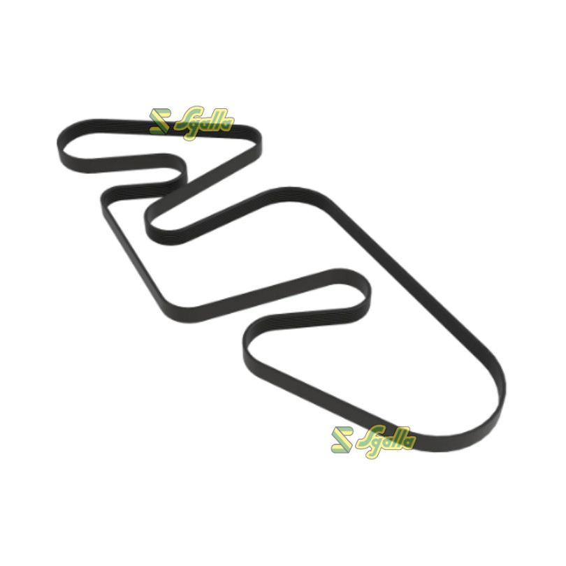 Cinghia John Deere ref. L223682. Cinghia trapezoidale del compressore d'aria con lunghezza effettiva di 3308 mm (130,24 pollici), numero nervature 8 e tipo di sezione PK. Soddisfa gli standard SAE J1459.