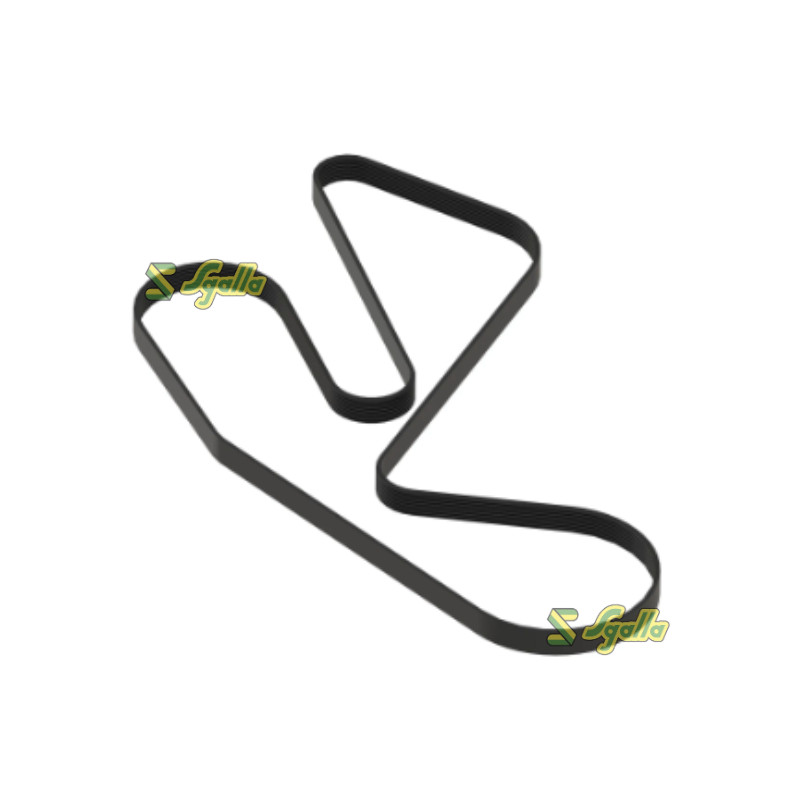 Cinghia John Deere ref. R540522. Cinghia trapezoidale della trasmissione della ventola, lunghezza effettiva di 2631 mm (103,58 pollici), numero di nervature 8 e tipo di sezione PK. Soddisfa gli standard SAE J1459.
