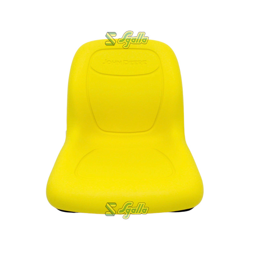 Sedile Giallo John Deere Regolabile Cod. VG11696. Il sedile è realizzato in vinile ad alta resistenza con imbottitura in schiuma durevole e di solito include un foro di drenaggio per evitare l'accumulo di acqua piovana o di lavaggio. Sebbene l'articolo specifico sia descritto come "regolabile", il sedile stesso è una seduta standard che si monta su meccanismi di regolazione preesistenti o su staffe specifiche.