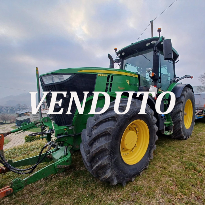 Trattore John Deere 7290R usato equipaggiato di sollevamento e presa di forza anteriori, assale anteriore sospeso, freni ad aria compressa, climatizzazione, cabina sospesa, mother regulation e gomme nuove. Anno 2018, macchina bellissima.